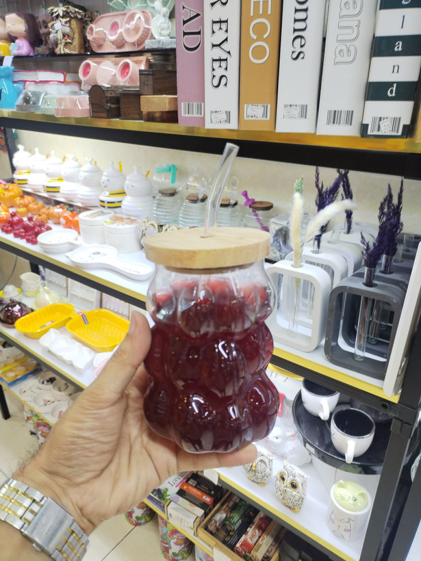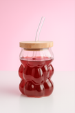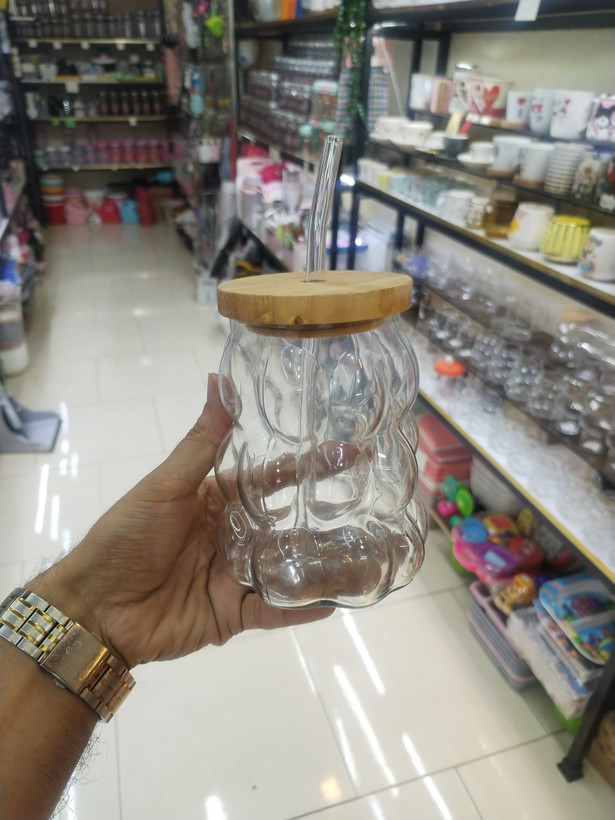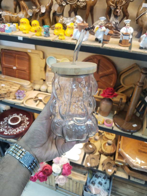 ماگ پیرکس حبابی درب بامبو همراه با نی شیشه ای
