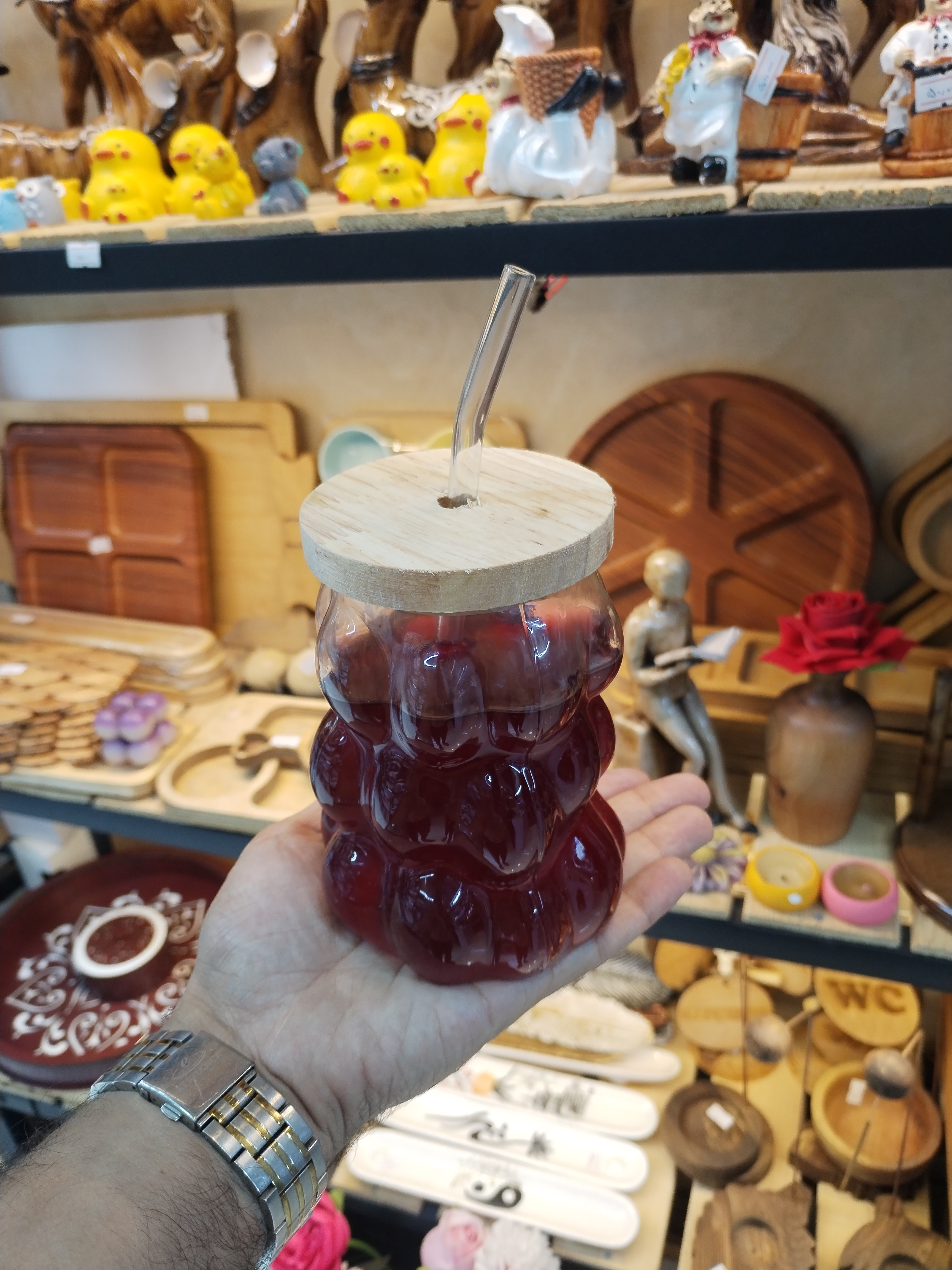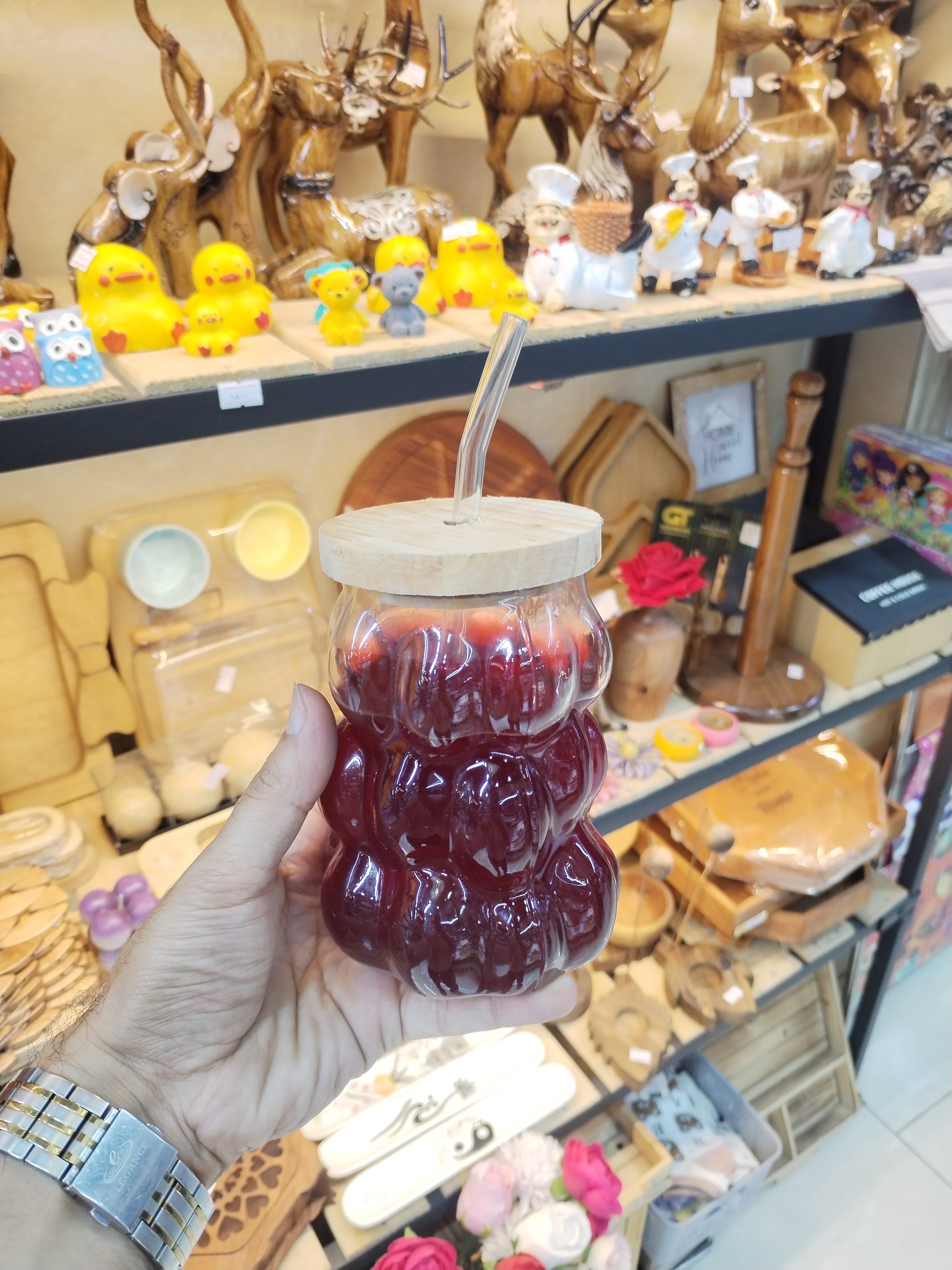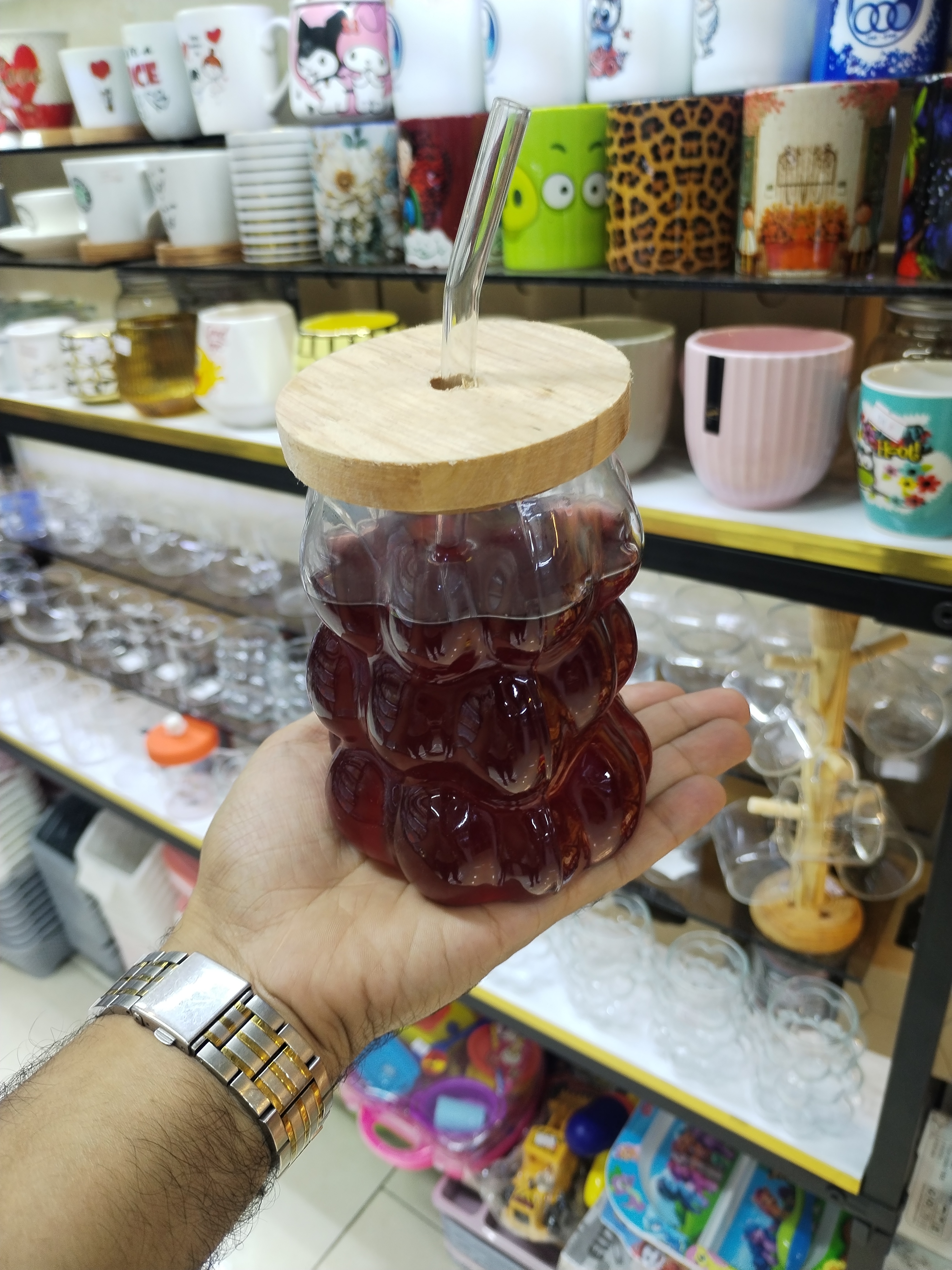 ماگ پیرکس حبابی درب بامبو همراه با نی شیشه ای
